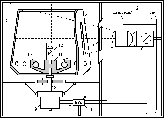 Стенд выполнен на основе центрифуги машины стиральной полуавтоматической бытовой, типа СМП-2Д (рис.). В корпусе 1 машины имеются две емкости 2, 3. В емкости 2 установлен источник направленного света 4. Свет от источника проходит через узкое прямоугольное отверстие 5 в корпусе машины в емкость 3. В емкости 3 установлен ротор 6 (экстрактор центрифуги). В его корпусе так же имеется узкое прямоугольное отверстие 7. Свет через это отверстие, один раз за полный оборот ротора, попадает в середину ротора. Поэтому наблюдатель видит внутренности ротора в одном и том же положении. Центрифугу 6 крепят к валу 8 двигателя 9 автобалансиры 10 (на схеме шаровой автобалансир), выполненные в виде планшайб. В корпусе автобалансиров выполнено соосно вала ротора резьбовое отверстие 11, в которое вкручивается источник лазерного света 12. Включение двигателя и света в емкости 2 осуществляется тумблерами "Двигатель" и "Свет". Управление скоростью вращения двигателя осуществляется через блок управления двигателем (БУД) 13.